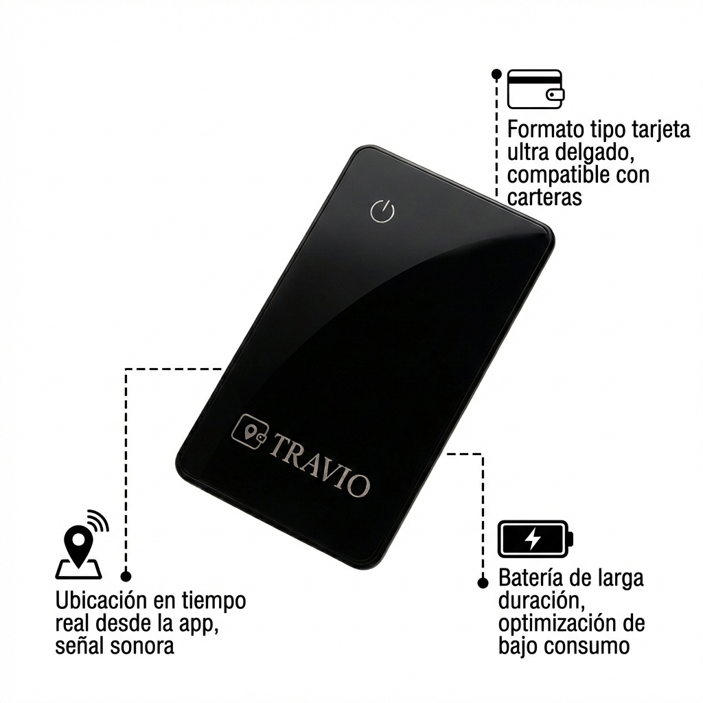 Sí, la Travio Tracking Card no se limita únicamente a tu cartera. Puedes usarla para rastrear distintos objetos como maletas, mochilas, teléfonos, pasaportes y más, brindando una solución de localización integral para tus esenciales del día a día.